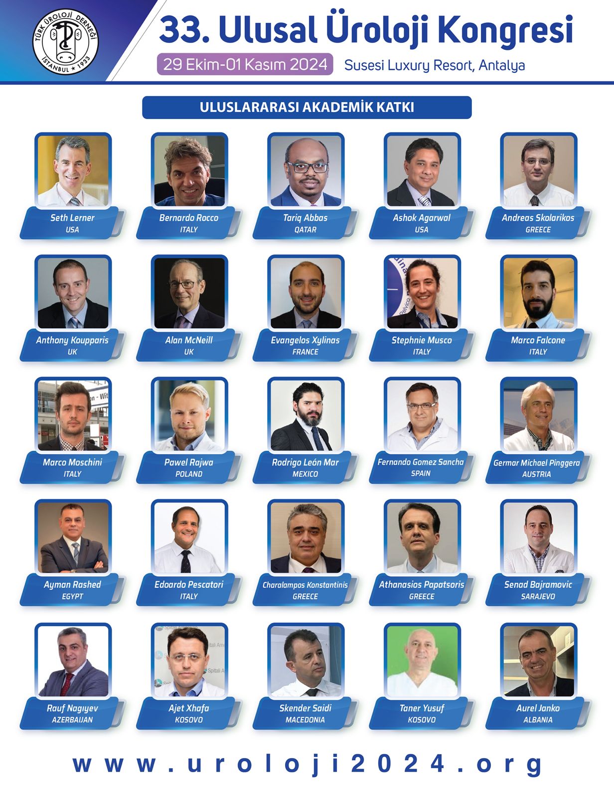 Türk Üroloji Derneği tarafından, 29 Ekim -01 Kasım 2024 tarihleri arasında, 33. Ulusal Üroloji Kongresi Antalya’da organize edilecektir.